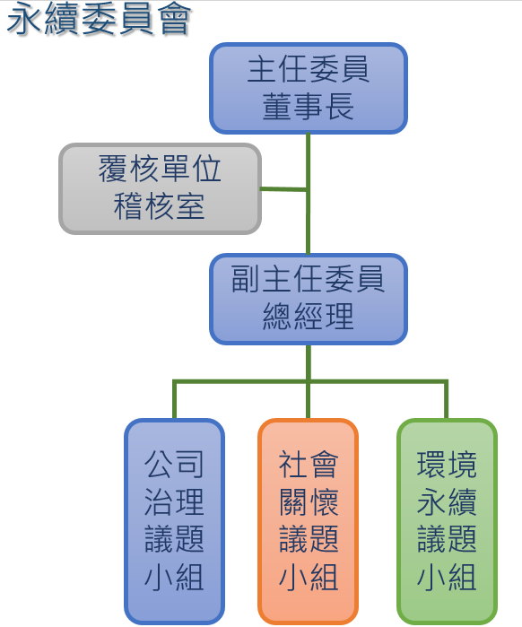 委員會轄下按照功能權責成立3個執行小組:環境永續議題小組、社會共融議題小組及公司治理議題小組,由總經理擔任總指揮、整合小組委員,並指派各小組權責部門主管擔任小組組長。執行小組負責辨識公司營運相關之ESG重大議題、擬定管理策略與目標及編制年度永續報告書,總經理將定期檢視執行小組之執行績效與目標達成度,並每年向永續委員會報告。