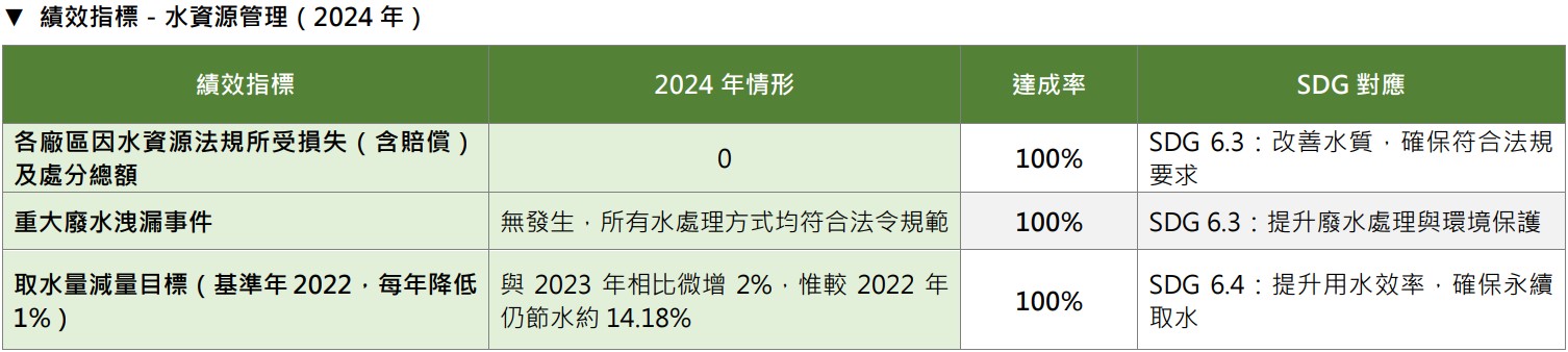 本集團重視水資源治理,將其納入永續發展策略,並以 ESG 指標作為推動依據,對應聯合國永續發展目標「SDG 6 淨水與衛生」。透過永續委員會監督管理、各廠區建置節水設備、推動水資源回收再利用及完善緊急應變機制,落實水資源的有效使用與保護。此外,所有子公司皆符合法規標準,2024 年度無重大缺水或排放異常事件,展現本集團落實水資源永續管理的承諾。