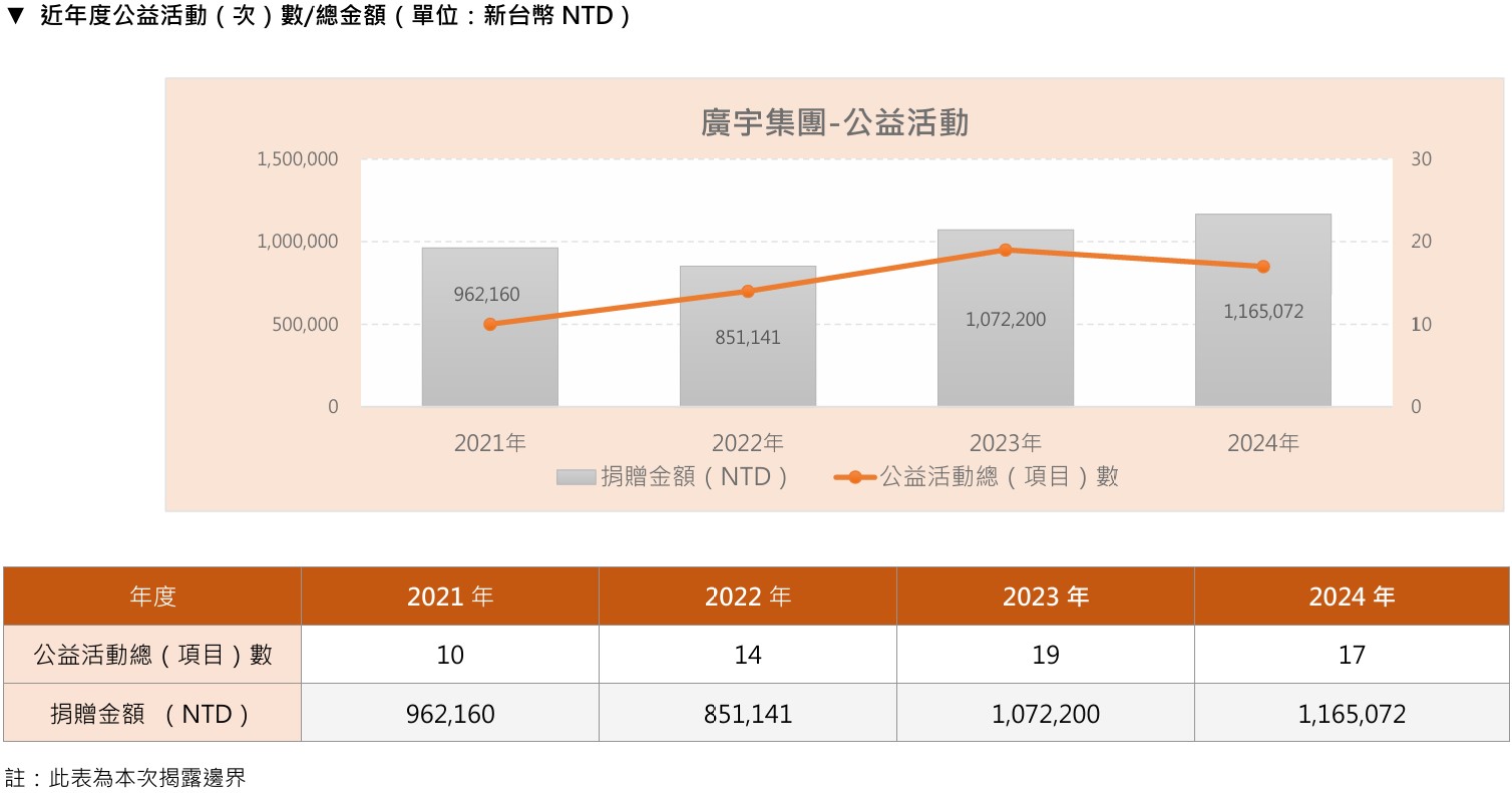 2024年本集團總共舉辦17項(20餘場)公益活動,實際捐款總金額1,165,072新台幣,相較2023年捐款總金額1,072,200新台幣,捐款總金額增幅8.66%,呈現穩定成長的趨勢,顯現公司對社會參與的重視與投入。 此外,我們還捐贈了無形資源,如物資、人員關懷及志工投入,進一步體現了公司對社會責任的承諾。