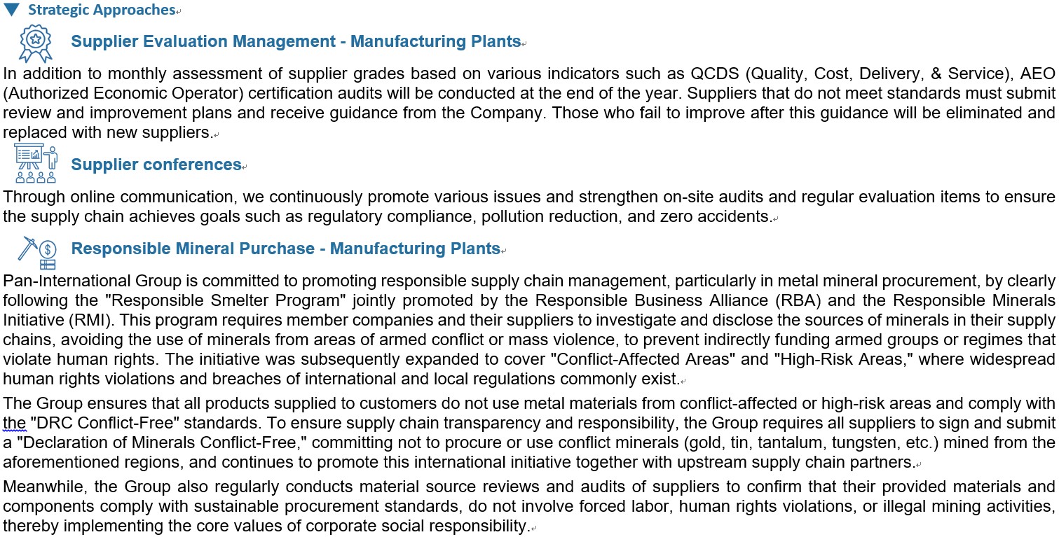 Furthermore, Pan-International conducts regular annual supplier conventions to reinforce awareness of business integrity, legal compliance, anti-corruption measures, and the responsible sourcing of minerals, avoiding conflict or high-risk materials.