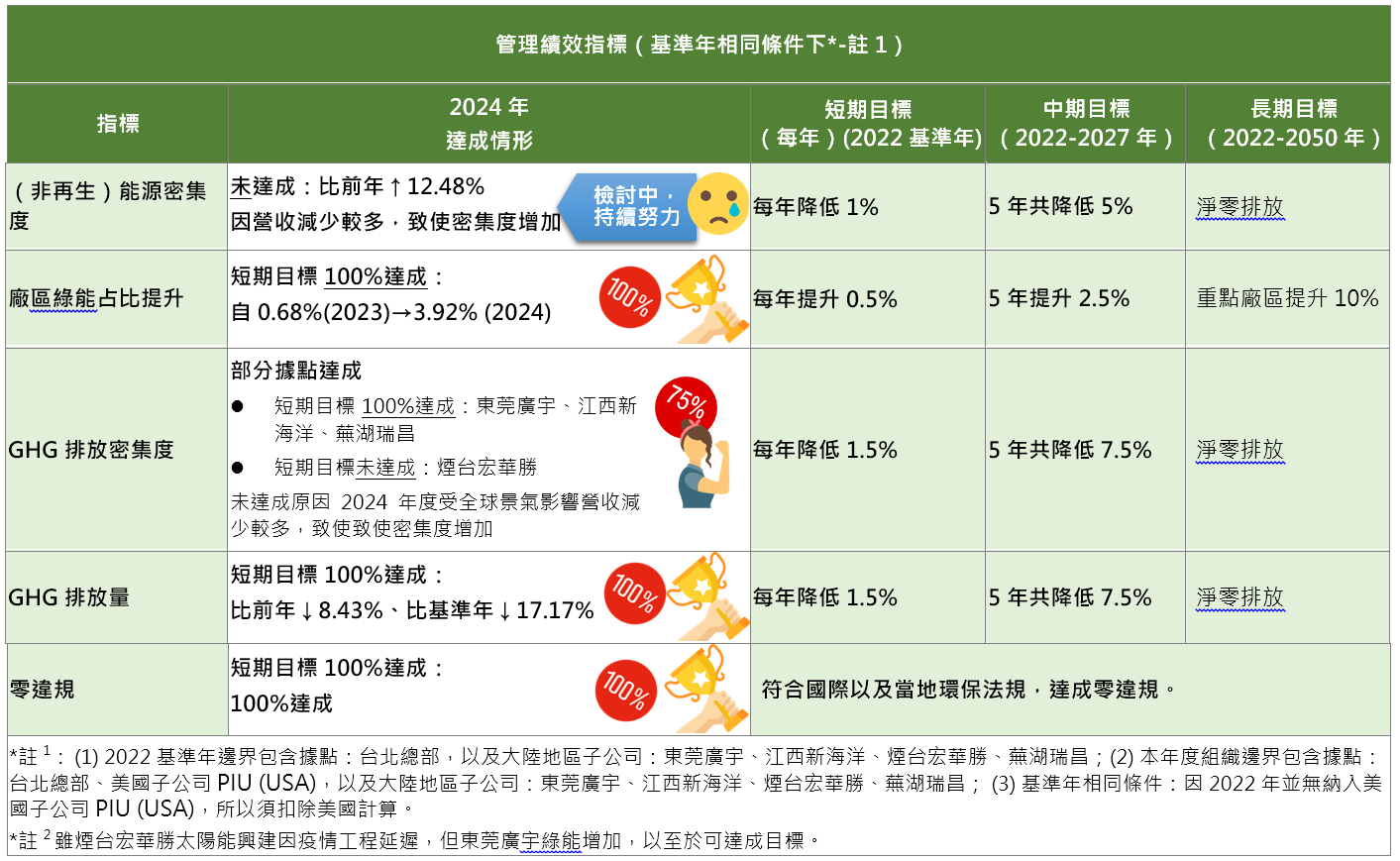 本集團台北母公司及大陸地區子公司(東莞廣宇、江西新海洋、煙台宏華勝、蕪湖瑞昌)自2022年起每年執行溫室氣體盤查,並以2022年作為基準年(涵蓋範疇一與範疇二)。範疇三之基準年則設定為2024年。位於美國的子公司PIU (USA)自2023年起開始盤查,惟由於其為10人以下之辦公據點,碳排量極低,未納入基準年計算範圍。